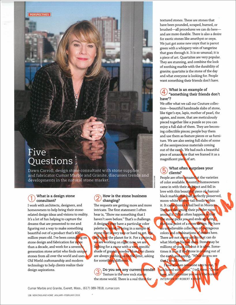 Dawn Carroll has been consulting on stone design and fabrication for the most prestigious architects, designers, builders, and interior designers for nearly three decades. She is one of the industry’s most highly-regarded stone consultants.